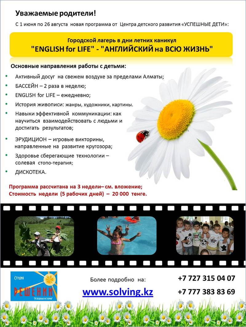 Основные направления работы с детьми: активный досуг на свежем воздухе за пределами Алматы; бассейн – 2 раза в неделю; English for life – ежедневно; история живописи: жанры, художники, картины; навыки эффективной коммуникации: как научиться взаимодействовать с людьми и достигать результатов; эрудицион – игровые викторины, направленные на развитие кругозора; здоровье сберегающие технологии – солевая стопо-терапия; дискотека.