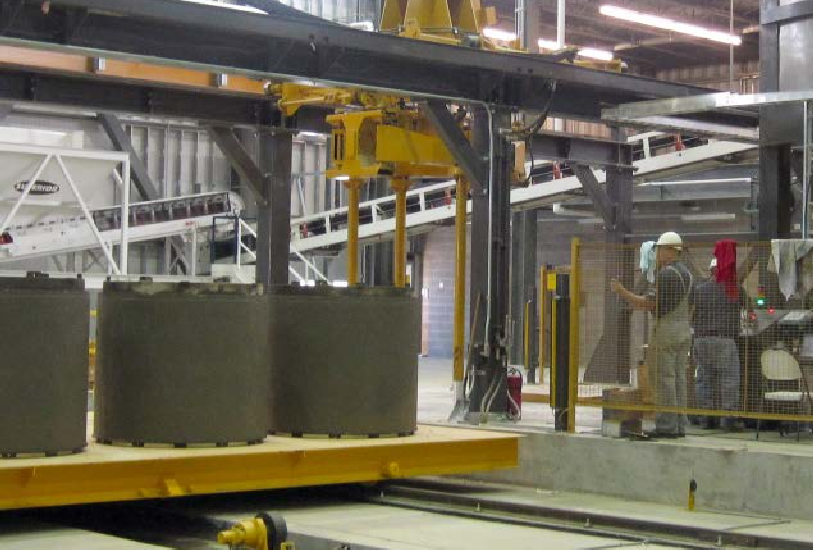 Изделия распалубливаются внутри машины, что экономит затраты на строительство и оборудование, устраняя необходимость в заводском мостовом кране.