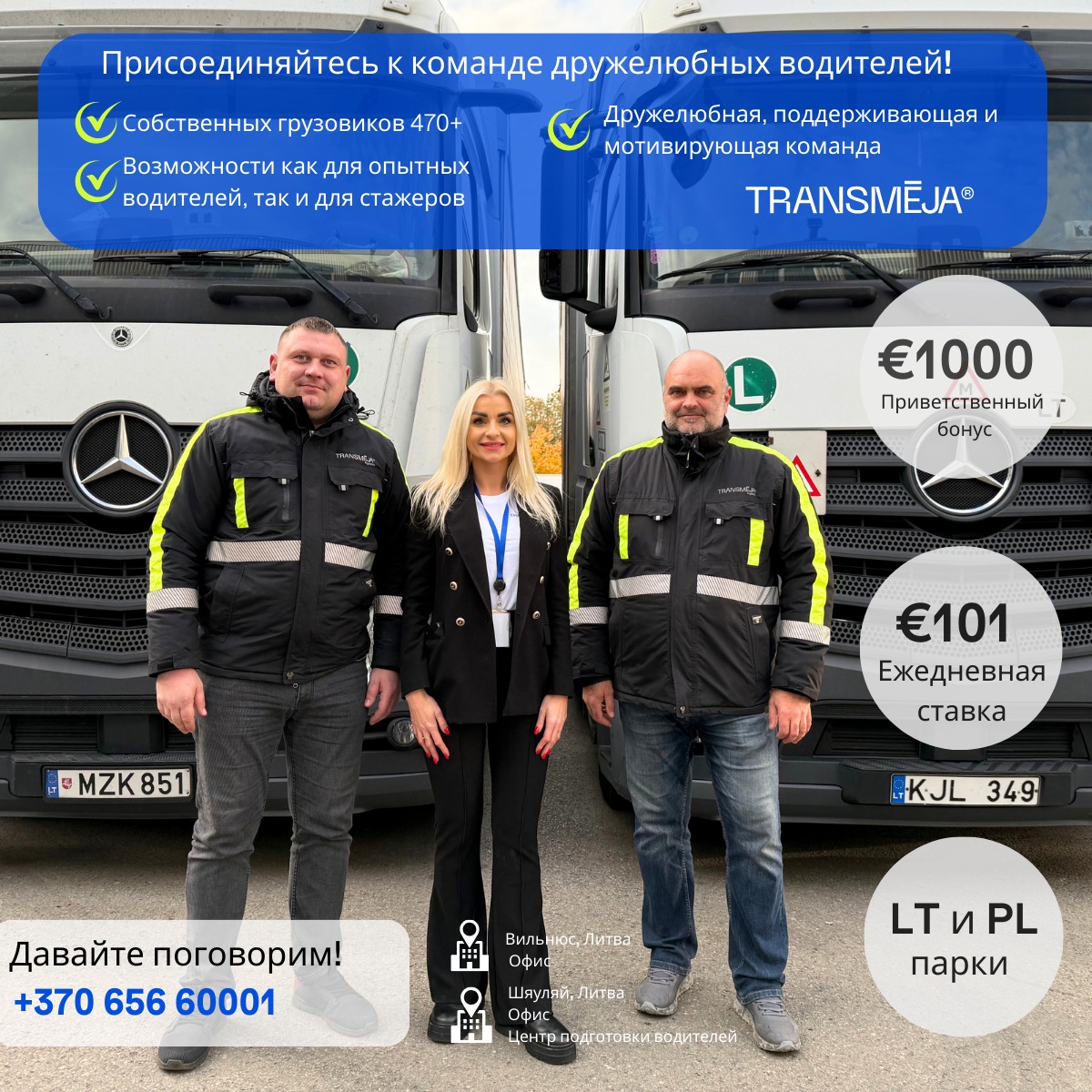 Международная транспортно-логистическая группа Transmėja приглашает водителей-дальнобойщиков присоединиться к своей команде по всей Европе — как с опытом, так и без него!